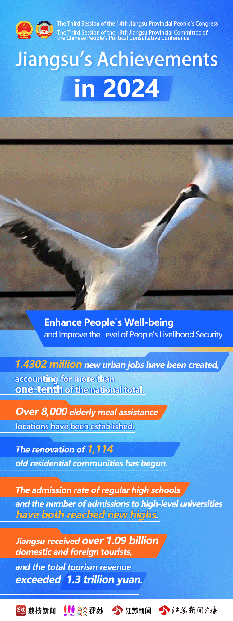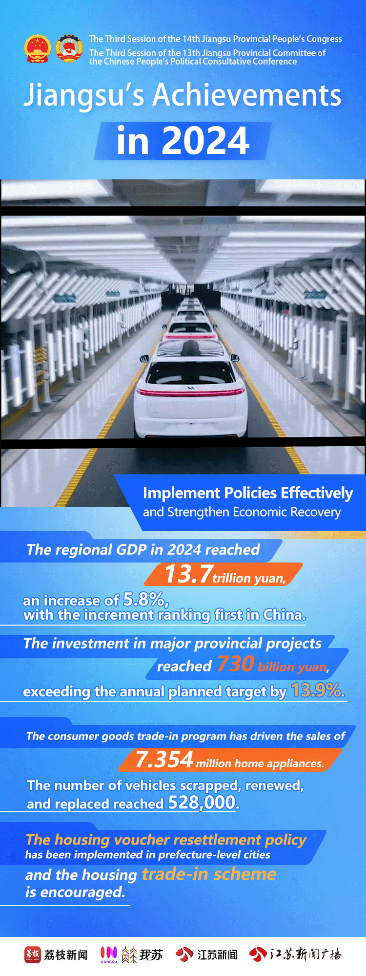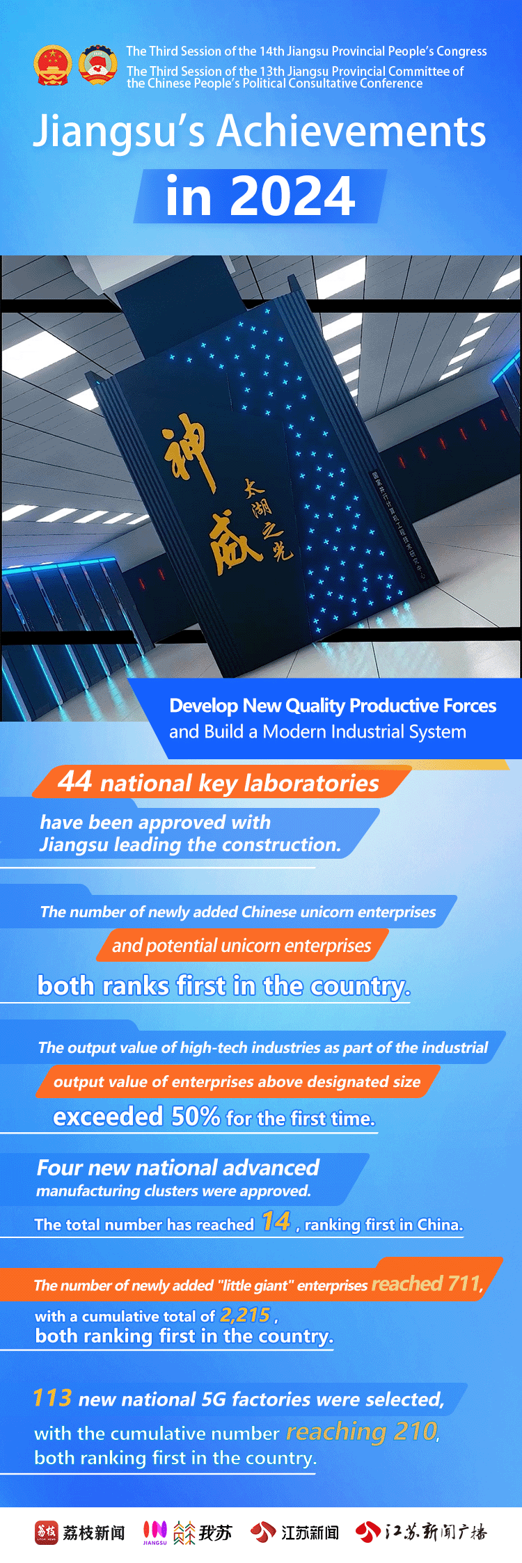 Naked-Eye 3D Dynamic Posters | Jiangsu's Achievements in 2024Issuing time:2025-02-10 16:34 On January 19th, the 3rd Session of the 14th Jiangsu Provincial People's Congress opened in Nanjing. Over the past year, Jiangsu has seen steady economic growth. Through high-quality development, Jiangsu has made achievements in its modernization drive featuring strong economy, prosperity for residents, beautiful environment, and developed culture and ethics. Let's take a look at Jiangsu's progress in 2024!