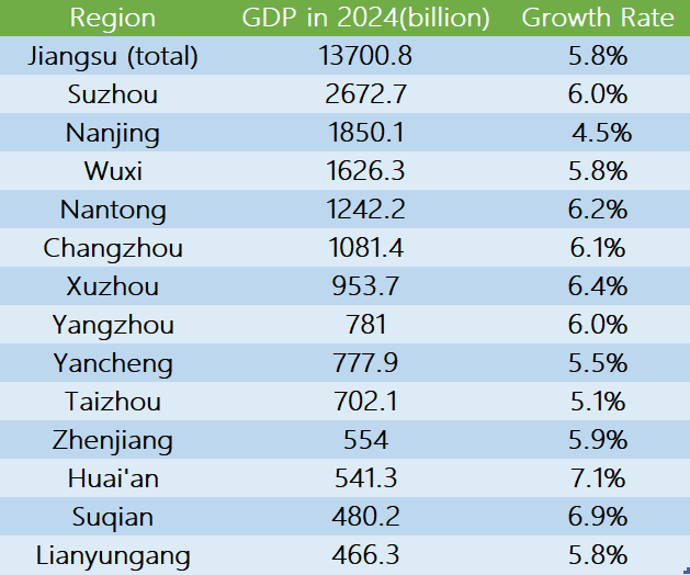 Jiangsu releases GDP data of 13 cities in 2024Issuing time:2025-02-11 09:40 Jiangsu Province has released the 2024 GDP data for its 13 cities on Feb. 7, as the GDP of the province reached 13.7008 trillion yuan, growing by 5.8%. Suzhou recorded the highest GDP at 2.6727 trillion yuan, with a growth rate of 6.0%. Nanjing, the provincial capital, followed with 1.8501 trillion yuan and a growth rate of 4.5%. Other cities that reached 1 trillion yuan include Wuxi (1.6263 trillion yuan, 5.8%), Changzhou (1.0814 trillion yuan, 6.1%) and Nantong (1.2422 trillion yuan, 6.2%). Xuzhou reported a GDP of 953.7 billion yuan with a growth rate of 6.4%. Huai’an had the highest growth rate at 7.1%, with a GDP of 541.3 billion yuan. Lianyungang (466.3 billion yuan, 5.8%), Yancheng (777.9 billion yuan, 5.5%), Yangzhou (781 billion yuan, 6.0%), Zhenjiang (554 billion yuan, 5.9%), Taizhou (702.1 billion yuan, 5.1%), and Suqian (480.2 billion yuan, 6.9%) also reported their respective GDP figures and growth rates.
